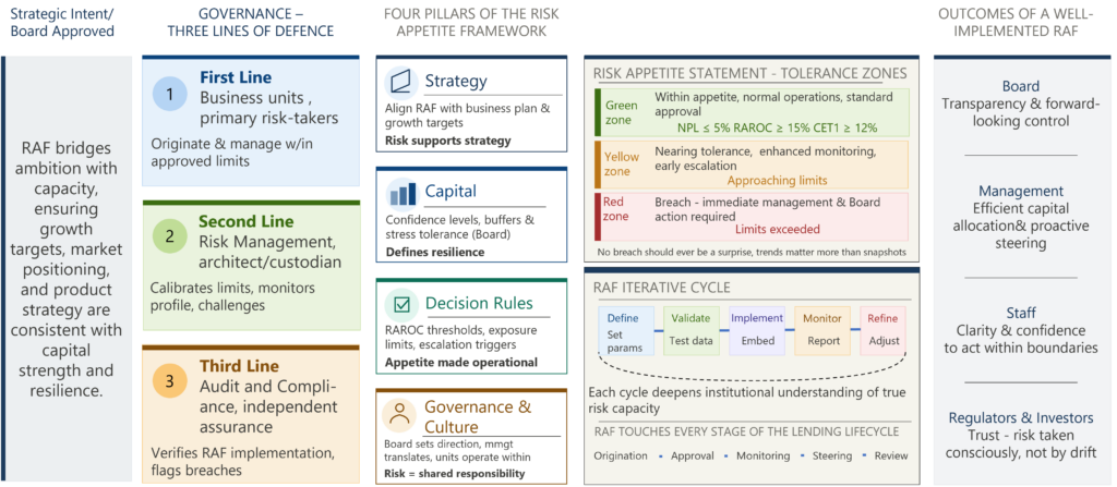 The analytical chain established in this series, PD, LGD, EAD, Expected Loss, Unexpected Loss, capital allocation, RAROC, provides precision about what risk is and what it costs. But numbers alone do not steer portfolios. People do. Institutions do. And institutions need a framework that translates analytical precision into managerial intent.